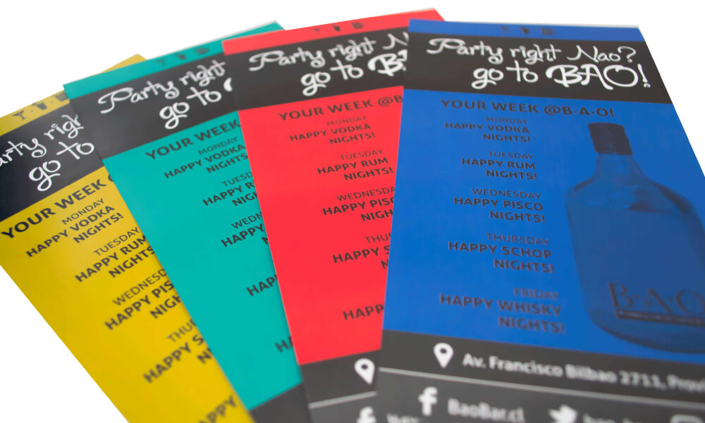 - Barniz U.V. a registro: Consta de barnizar ciertas áreas del sustrato para hacerlas más llamativas a la vista. Se puede aplicar en una o en las dos caras del sustrato y puede ser sobre el sustrato mismo o sobre sustratos laminados.